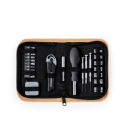 Inclui chaves de tubo, um conjunto de chaves de precisão (plana e cruzada), uma pega multifuncional com várias pontas intercambiáveis, um estilete e uma fita métrica.