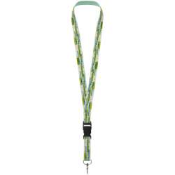 Lanyard em PET reciclado com impressão em sublimação em toda a superfície. Equipado com um gancho metálico e separador em plástico reciclado.