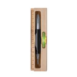 Vem numa caixa robusta em bambu, com nível integrado e régua.