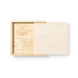 Jogo de Habilidade em madeira resistente. Contém 13 peças, todas organizadas numa caixa de madeira com tampa.
