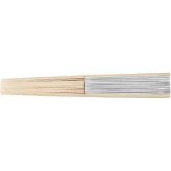 Leque de bambu e papel, embalado em saco plástico.