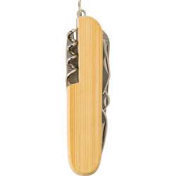 Canivete multifuncional em bambu e aço inoxidável.
