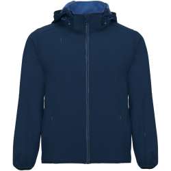 Veste softshell unisexe com capuz dobrável, impermeável e corte desportivo, ideal para atividades ao ar livre. Disponível em várias tamanhos.