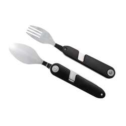Talheres dobráveis em aço inoxidável 420, ideal para uso alimentar. O cabo é em alumínio, garantindo leveza e resistência. Com um sistema magnético inovador, podem ser facilmente separados em duas partes, formando uma garfo e uma faca (ou uma colher).